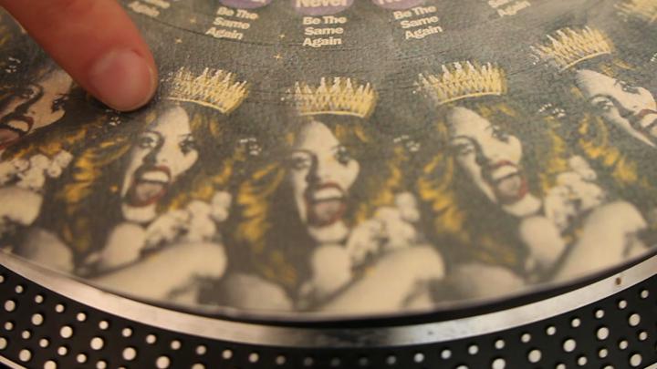 Doch der Plattenteller ist kein Samsara, sondern vielmehr ein Kaleidoskop, eine Spiegelung, die auch ein „Best Of“ berühmter Platten und deren Cover-Artworks der letzten 30 Jahre präsentiert; darunter finden sich Nirvanas „Nevermind“ (wie passend!), Michael Jacksons „Thriller“, Björks „Debut“, oder eben Madonnas „True Blue“ und Massive Attacks „blue lines“. Popmusik als das ewig Gleiche? Der VJ/DJ als Schamane? Wohl eher als jener, der den idealen Moment im „Spinning“ und „Mixing“ von Tönen und Bildern findet und diesen ins – beinahe – Unendliche verlängern kann, bis zum nächsten Übergang. Insofern bleibt letztendlich die Handarbeit der Garant für den Autor hinter der Apparatur – und nicht umsonst schließt diese Echtzeit-Extravaganz mit der ins Bild gestreckten Handfläche des Künstlers, auf der Titel und Credits notiert wurden: handschriftlich.