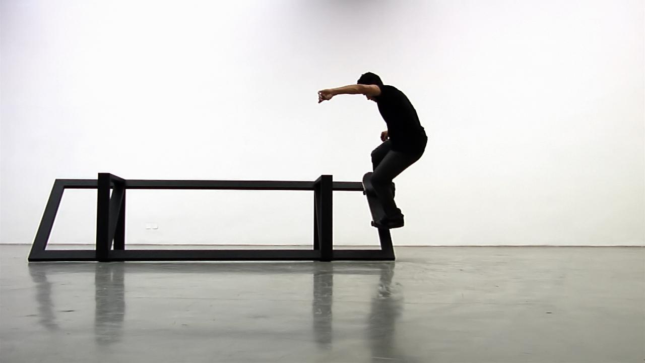 Gemeinhin ist das Berühren von Kunstgegenständen in einem Ausstellungsraum nicht erlaubt. Nicht so in Kay Walkowiaks Minimal Vandalism, wo dieses Verbot geradezu mit Füßen getreten wird. Das Setting ist jenes der Generali Foundation in Wien, Inbegriff eines modernistischen Ausstellungsbaus, der – als neutrale, White-Cube-artige Hülle – in den Akt der Kunstbetrachtung selbst so wenig wie möglich intervenieren soll. Wäre da nicht die schlauchartige Raumflucht mit der mächtigen Betonwand in der Mitte, entlang der in Minimal Vandalism ein Parcours aus minimalistischen Skulpturen aufgebaut ist. Und ein Parcours ist es führwahr, denn nach kurzer Exposition – die ruckartig bewegte Kamera lässt schon Böses erahnen – wird hier eine gänzlich unerwartete Performance entfacht. Kurz sieht man, in einer der wenigen ruhenden Einstellungen, eine Überwachungskamera, und schon geht das Schauspiel los: Aus der Tiefe des Raumes kommend, nimmt ein Skateboarder (Kilian Martin) auf drei übereinander gestapelten Brettern Anlauf, um die Skulpturen einem Härte- bzw. Geschicklichkeitstest zu unterziehen. Der „Performer“ bezieht die Objekte, Kunst hin oder her, unerbittlich in seine Akrobatik mit ein, gleitet an ihnen hoch, schlittert über ihre Oberflächen oder überspringt sie mit Bravour. Inszeniert ist das ganze mit wuchtig hallendem Sound, was die stille Anmutung der Minimalskulpturen noch zusätzlich bricht. In dynamischem Einstellungswechsel sieht man nach jedem ausgeführten Akt in Großaufnahme den Schaden, der so angerichtet wurde. Aber auch hier scheint es, als würden die Objekte durch die bizarren Kratzer, Schleifspuren oder abstehenden Metallspäne mehr zum Leben erweckt als dass sie dadurch ruiniert würden. Der Raum wird vom Blick her mehrfach der milchgläsernen Decke und dem verschlierten Magnesit-Estrich entlang durchmessen – die kurzen, abrupten Skateboard-Fahrten enden aber stets dort, wo ihr eigentlicher Adressat liegt: bei den abstrakten Kunstgegenständen, die so mit sportiver Vehemenz aus ihrem kontemplativen Schlaf gerüttelt werden.