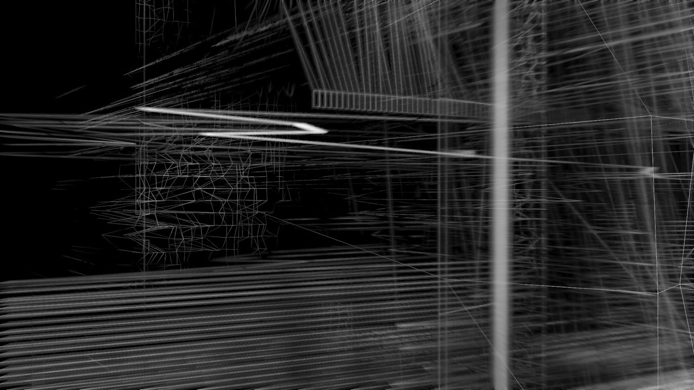 Dies geschieht zur selben Zeit mit mehreren Flächen, die zusammen eine Architektur bilden, die wiederum der Ausgangspunkt für die Animation darstellt. Diese Flächen setzen sich aus Linien zusammen, deren Anzahl gesteuert wird und die somit auch als ein Faktor in der Brechung oder Faltung des Raumes Einfluss nehmen. Es passieren Raumbrechungen, die sich innerhalb der Architektur nochmal als Räume im Raum bzw. Projektionen von verschiedenen Räumen überlagern.