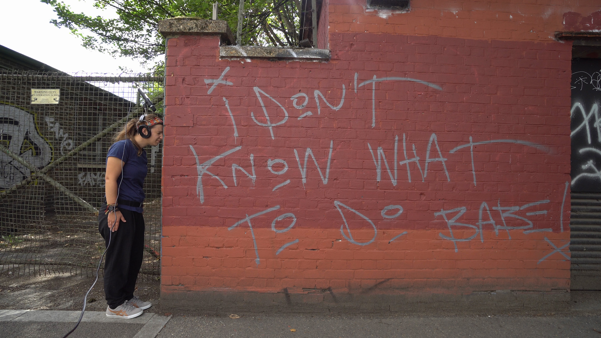 Wenn sich auf Reisen die Grenzen der eigenen Sprache nicht überwinden, Wünsche nicht mehr in Worte fassen lassen, dann werden mitunter körperliche Gesten schlagend. Es gilt zu einer Verständigung zu finden, sich zur Welt ins Verhältnis zu setzen. Der eigene Körper wird dabei zum Medium, konkret und direkt. Verständnis mag sich einstellen oder aber Ratlosigkeit und Missverständnisse treten erst recht zutage. Anna Vasof lässt ihren Kopf wie einen Drumstick, mal ganz zart und vorsichtig oder fest und schmerzhaft aufschlagen und sie lässt dabei offen, ob sie an der Welt verzweifeln muss oder aber eins mit ihr wird. Ihr eigener Körper wird zum Instrument und die Stadt, die sie sichtbar umgibt, zum Resonanzraum. Der Schlag des Kopfes gibt den Rhythmus vor, das Soundscape eines jeden Orts liefert die unverkennbare Melodie. Manchmal werden die Städte zudem an markanten Sehenswürdigkeiten erkennbar, immer sichtbar ist Anna Vasof: sie tritt ins Bild, rückt noch schnell das Mikrofon auf ihrem Kopf zurecht, prüft vielleicht die Umgebung oder ihre eigene Position und los geht´s: Der Titel hat angekündigt was zuverlässig folgt: die Künstlerin haut sich ihren Kopf an, in der jeweils erwähnten Weltstadt, und landet mit jedem Schlag einen Treffer. Ihr Vorgehen bleibt nüchtern, kein Stunt, kein Trick spielt sich ab. Anna Vasof tritt uneitel ins großstädtische Bild und berührt so eine Stadt und dabei ihr Publikum. Nicht weil geheime Peinlichkeiten oder voyeuristische Einblicke bereitet würden. Doch Vorsicht: Diese Kamera zeigt uns die Welt nicht wie sie ist. Anna Vasof erinnert mit jedem Schlag knallhart an eine große Wahrheit, nämlich daran, dass wir die Dinge immer nur so sehen, wie wir sind. (Brigitte Felderer)