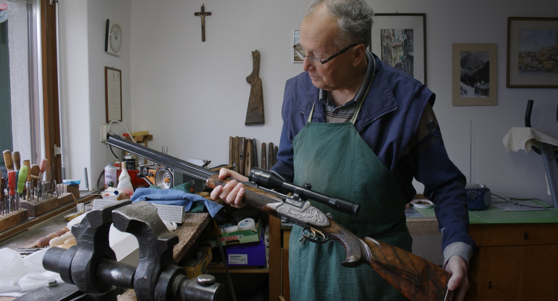 Das Wetter ist gut, die Lichtstimmung sanft, zwei Buben stehen im Park und betrachten durch ein aufgestelltes Diagerät Fotos, auf denen Aspekte des für die Gegend so charakteristischen Handwerks zu sehen sind. Auf der Tonebene erklingt ein deutschsprachiges Kärntnerlied, klassischerweise interpretiert von einem Männerchor, der alsbald die Leinwand füllt. Die Herren in Pleamlemusterwesten besingen das Rosental, in dem die Stadt Ferlach/Borovlje liegt, berühmt für die Büchsenmacherei – ein Ende der Welt, an dem es hallt und knallt.