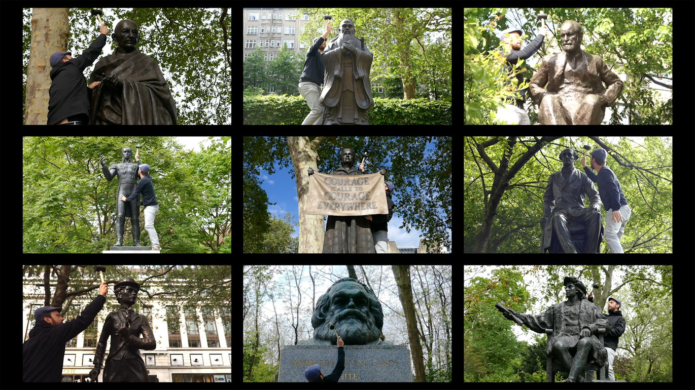 In HARD-HEADED HARMONY nine bronze statutes in London of historic figures ranging from Marx to Charles Chaplin are arranged on a single screen; Heindl climbs them all to create a synchronised tone with a hammer.