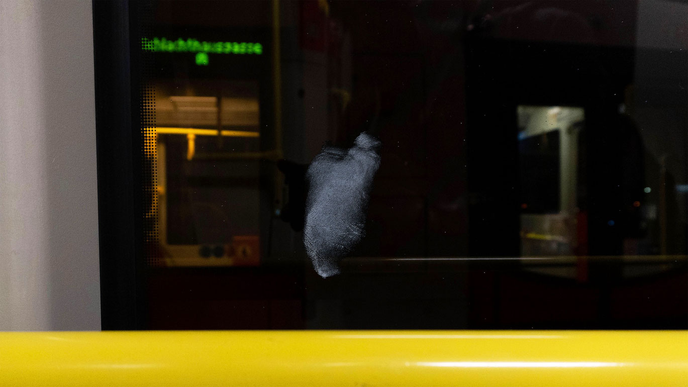 A trip on Vienna's public transport system provides the framework for a special exploratory expedition by virtue of the conceptual delight with which Michael Heindl approaches everyday trivialities. His protagonist is an amorphous creature who takes center screen: Its dirty white form emerges from the brittle darkness, gradually pushing itself to the front. Reminiscent of an embryo and ceaselessly changing, it pulsates like a single-cell organism under the microscope, growing into a grey madcap: These are traces of bodies, smudges found on panes of glass and other surfaces, they appear roughly smeared or delicately dotted, ranging from amorphous streaks to fingerprints and handprints, kissing lips, smiley faces, numbers, letters and symbols. The synthetic starry night of dust particles surrounding the images endows them with a vaguely cosmic (and comic) quality.