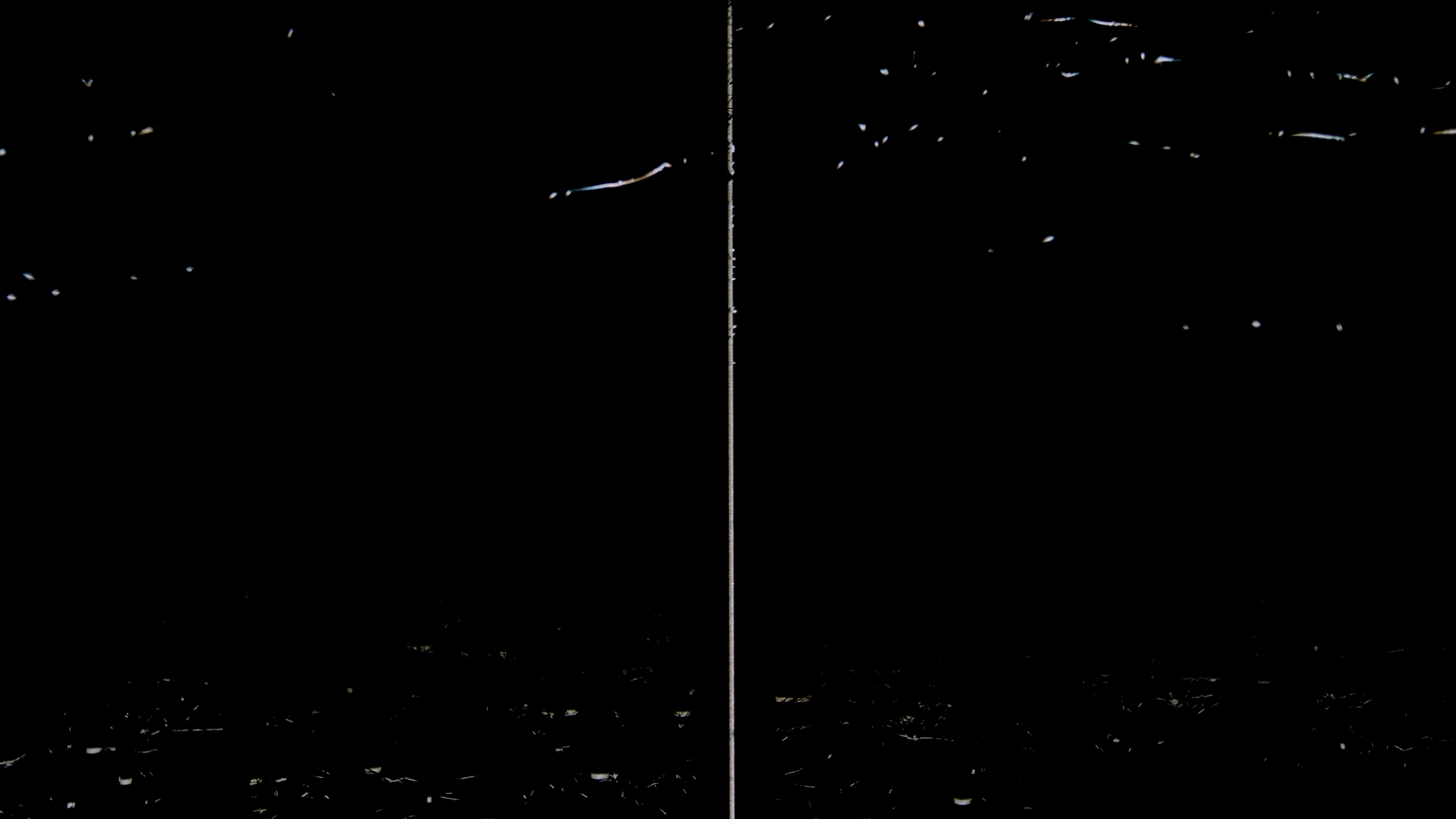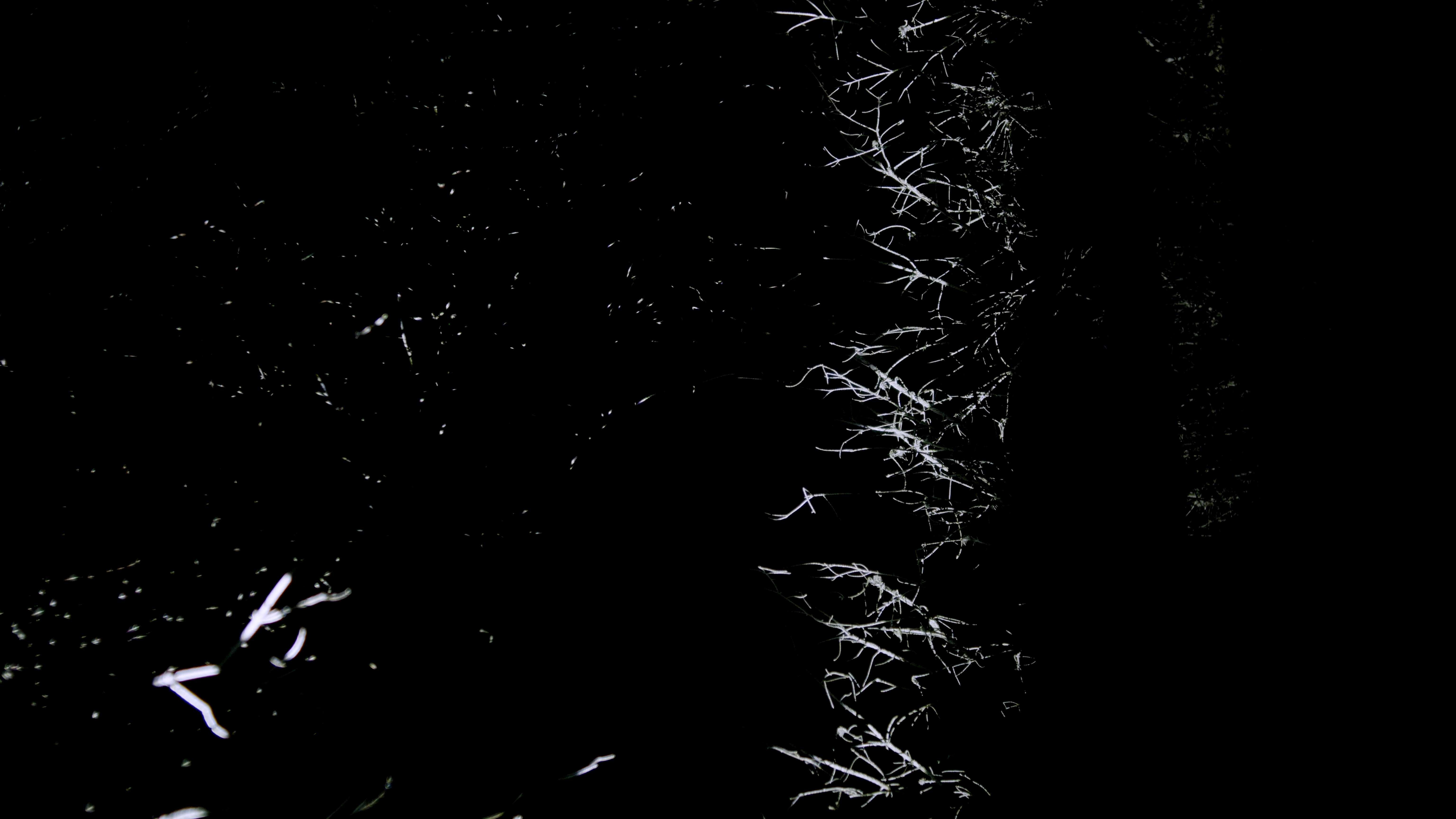 A light barrier is set up at the beginning: the illusion of a screen briefly split. After a few seconds’ delay, particles begin to fly in a precise, harsh circular dance of vertical and horizontal highlights. The black noise of the soundtrack has also emerged organically, as it were, as it consists of recordings of a storm rushing through the forest. Midway through the work and at its end, a kind of short circuit paralyzes the image and sound like an implosion – an acoustic shock originating in the cracking of a branch. The deep black of the night and the glaring white of the projected light are complemented by a hint of delicate natural color. de natura tenebrarum – about the nature of darkness appears at once abstract and figurative, microscopic and cosmic: a film that combines cave painting and futuristic writing.