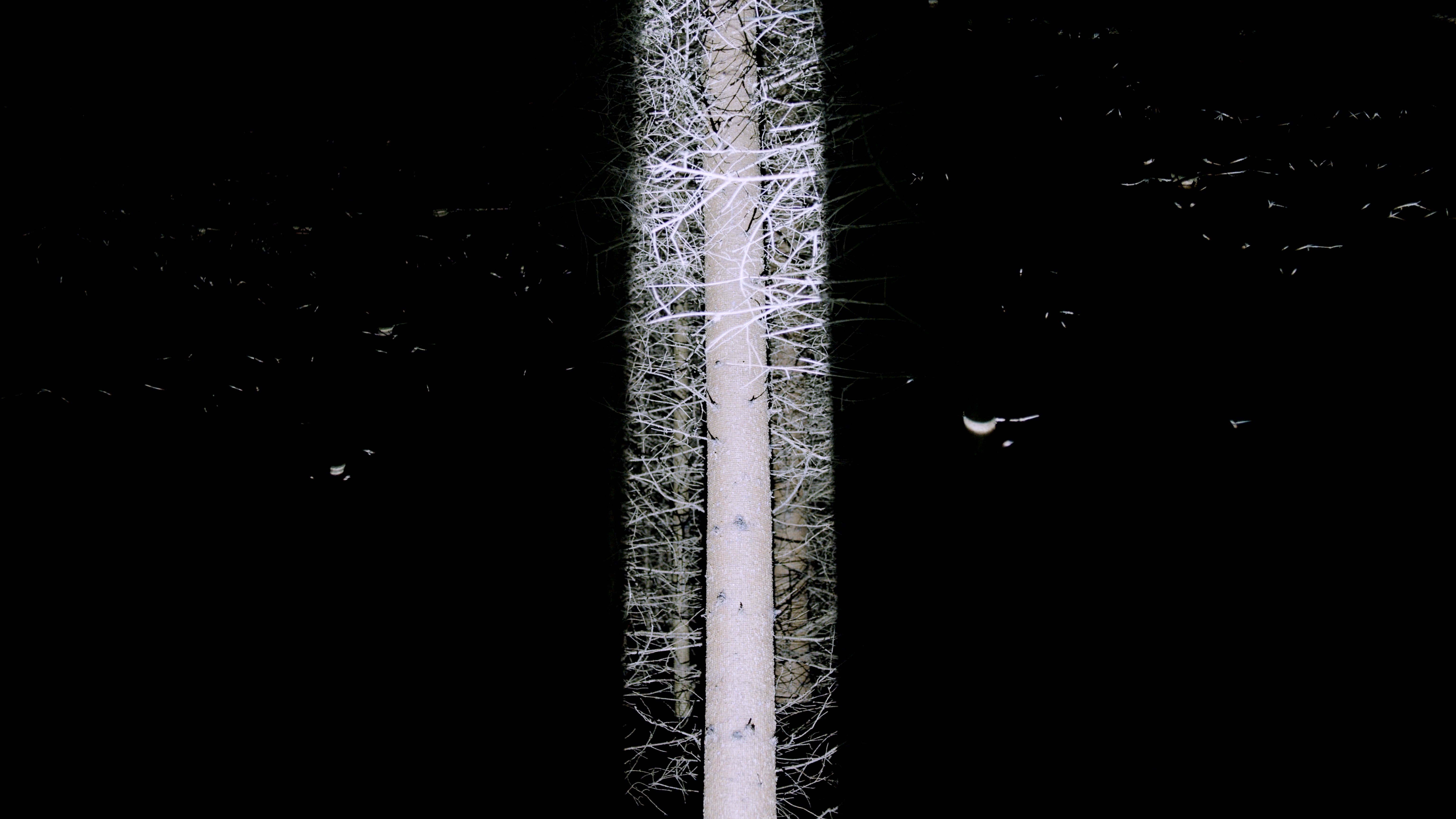 The moral self-assurance of fairy tales is lost in the depths of the dark forest haunted by Manuel Knapp with his projection and recording equipment. He casts filigree white light, the strange calligraphic signals of a digital abstraction, into the existential darkness of a wintry forest landscape under a new moon; and by flashing a kind of writing on branches and tree trunks, he creates a cryptic choreography, a game of concealing and revealing.