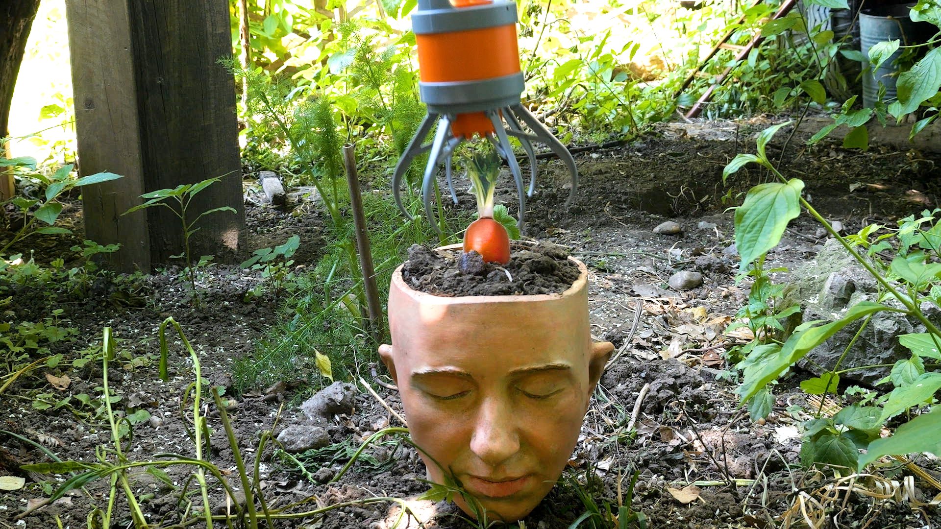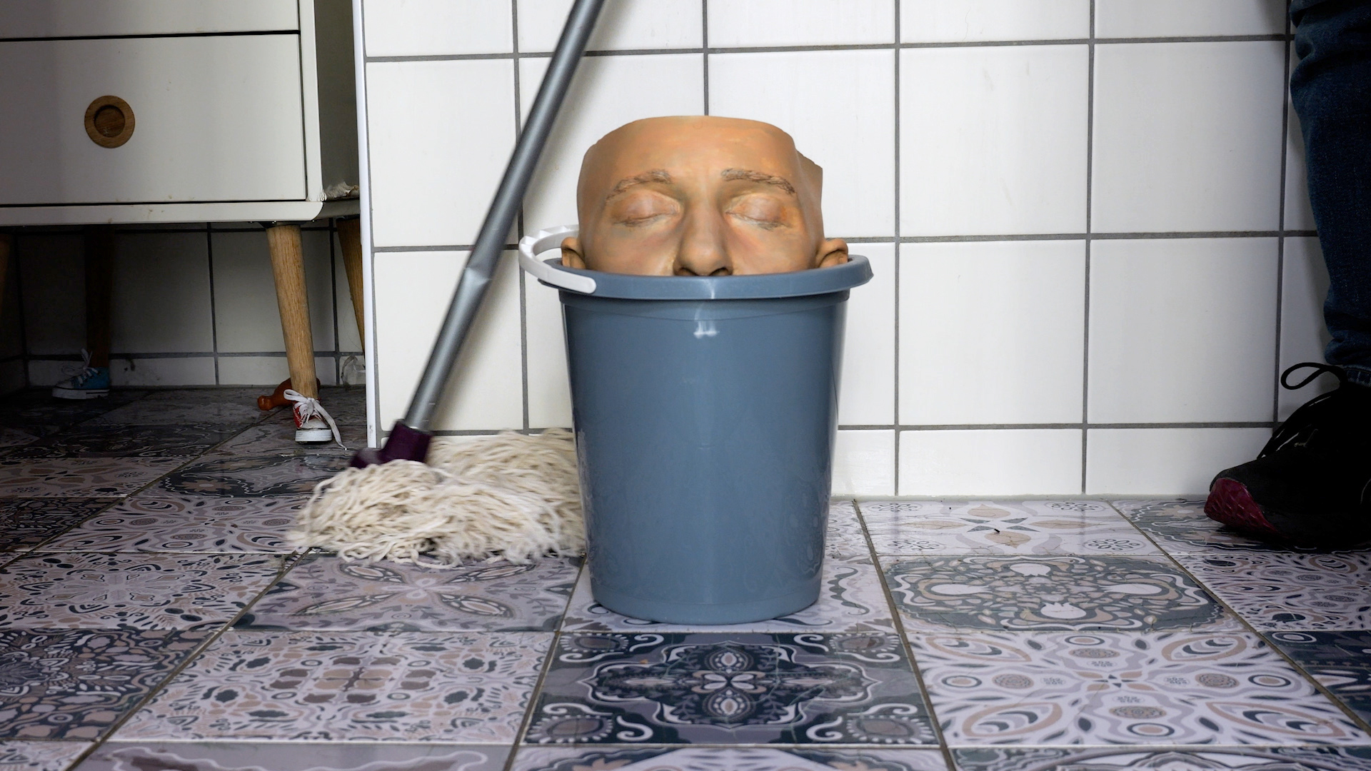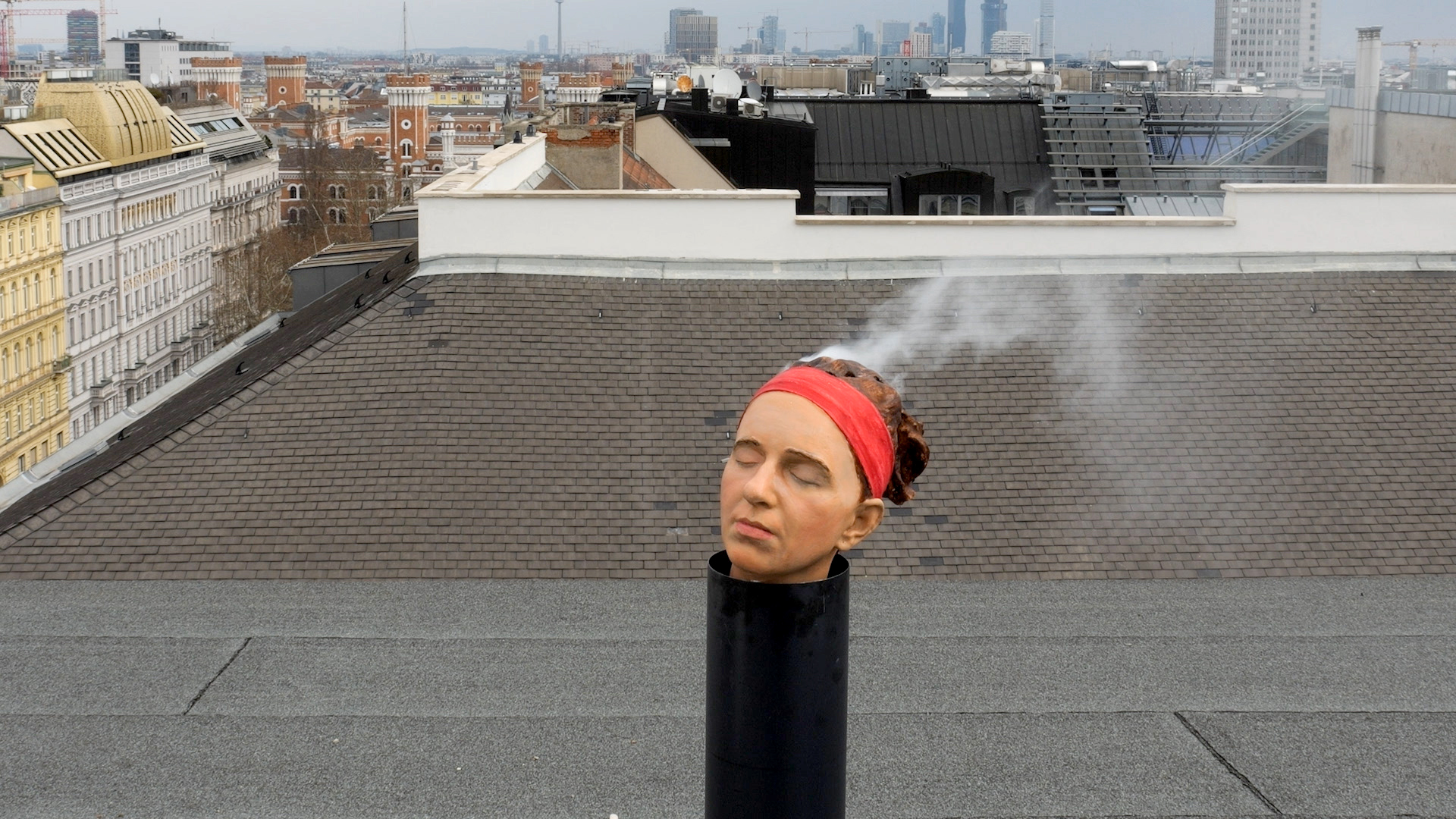 In Headworks, her ten-minute episodic film, the “object and media magician” Anna Vasof plays with the pictorial language of idioms. In 25 humorous miniatures, Vasof takes sayings about the human head literally, puts them in visual form, and gives them a three-dimensional existence. To do this, she uses her own head, which she has made casts of on many previous occasions. Sometimes Vasof places this head on a lifesize torso; or for example she pulls a woolen strand out through its nose from a ball of yarn on top of its open skull. Her head smokes, sits in a bucket, or is about to burst. Often, absurd contraptions exert manmade pressure on the heads. While Vasof’s visualizations are witty, sometimes they also hold secrets within: the images generate their own semantics, allowing for a joyful excess in these minimalist scenarios.